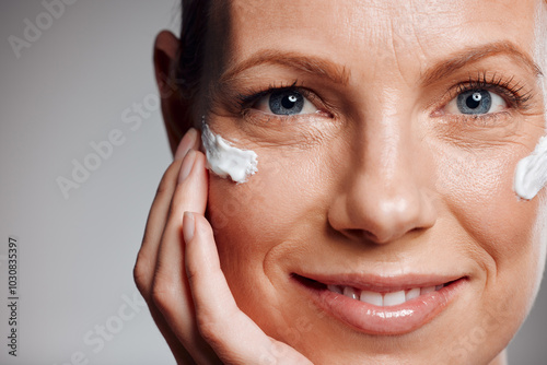 Portrait, mature woman and skincare cream for hydration, beauty or closeup. Lotion, happy model or hand apply cosmetics on face for dermatology, shine or glow for anti aging on gray studio background