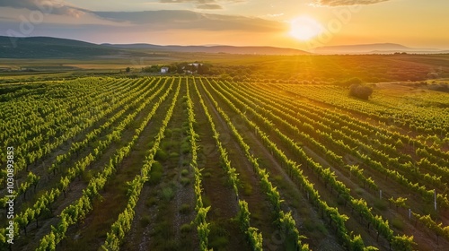 Croatian Sunset Splendor: Captivating Aerial View of a Vineyard Field in the Countryside