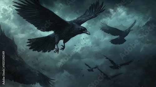 A murder of black crows with sharp talons, glaring eyes, soaring under a tempestuous, brooding sky