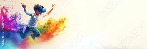young boy wearing a virtual reality headset, mid-jump, immersed in a world of colorful digital and augmented reality.