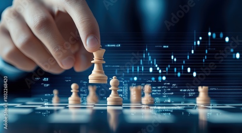 A close-up of a hand making a move in a chess game, symbolizing strategic thinking and decision-making, with digital data graphics in the background.