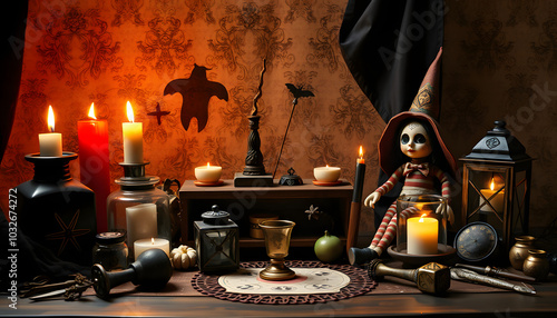 Wicca, esoteric and occult still life with vintage magic objects and voodoo doll on witch table altar for mystic rituals and fortune telling. Halloween and gothic concept isolated with white highlig