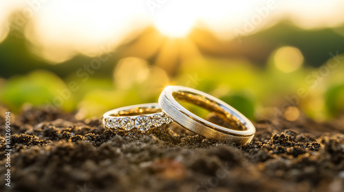 Two elegant wedding rings rest gently in a natural setting, symbolizing the unity of marriage, eternal love, and the connection between human bonds and the beauty of nature