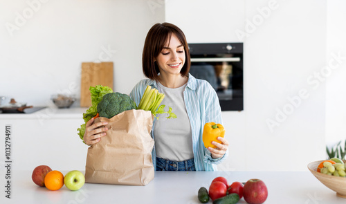 Young lady unpacking grocery bag after shopping, putting vegetables on table in kitchen interior at home, copy spsce. Dinner preparation and household leisure concept