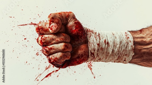 Bleeding bandage, fight club, street fight, violence, bloody theme, white background, boxer, isolated, bloody fists, and bound his hands with a bandage. He also shook his bloody hand in the bandage.