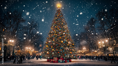 A large Christmas tree stands majestically in the middle of a city square in the United States, decorated with colorful lights, glass balls, and a gold star on top, Ai generated images