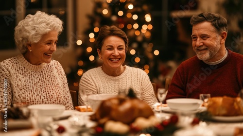 Three of a family seated around a warm and cozy holiday dinner table sharing laughter joy and festive cheer together The scene exudes a sense of togetherness tradition