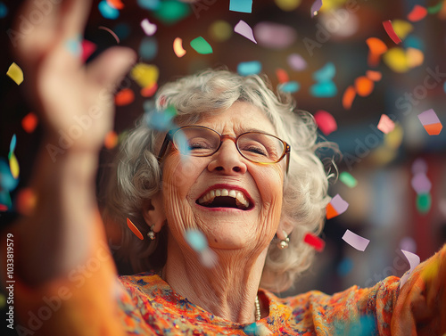 Celebracja - szczęśliwa starsza pani i spadające błyszczące konfetti.