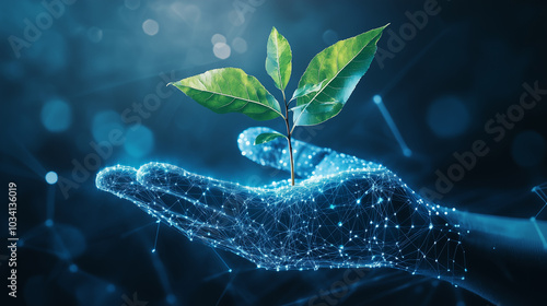 Cyfrowa dłoń w otoczeniu niebieskich, świetlistych linii wspiera roślinę, symbolizując współistnienie ekologii i postępu technologicznego.