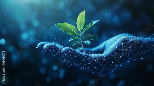 Cyfrowa dłoń w otoczeniu niebieskich, świetlistych linii wspiera roślinę, symbolizując współistnienie ekologii i postępu technologicznego.