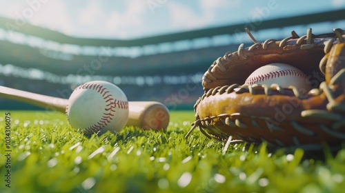 Baseball arena scene with a detailed shot of baseball gear--bat, glove, and ball--on vibrant green grass, under daylight, ideal for ads