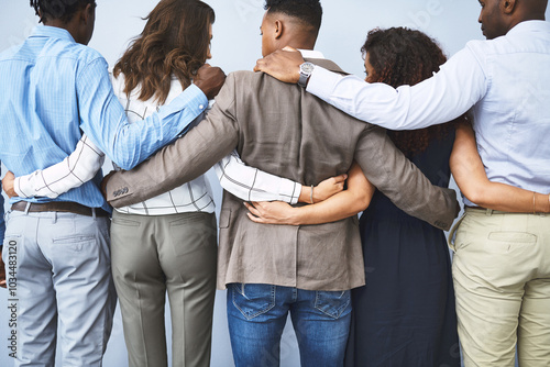 Back, group and business people with hug in office for team building, unity and support in meeting. Corporate, employees and worker with gesture for motivation, collaboration and trust at company