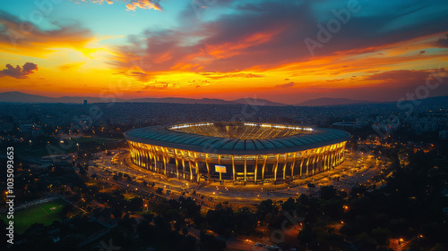 Aerial drone twilight sky photo of brand new soccer,football stadium of AEK Agia Sofia in public park of Filadelfia, Athens, Attica, Greece