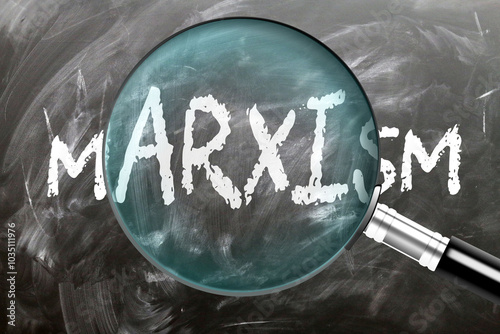 Marxism - learn, study and inspect it. Taking a closer look at marxism. A magnifying glass enlarging word 'marxism' written on a blackboard ,3d illustration