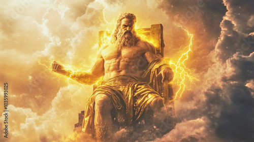Zeus descends from his throne with lightning in hand amid gathering storm clouds