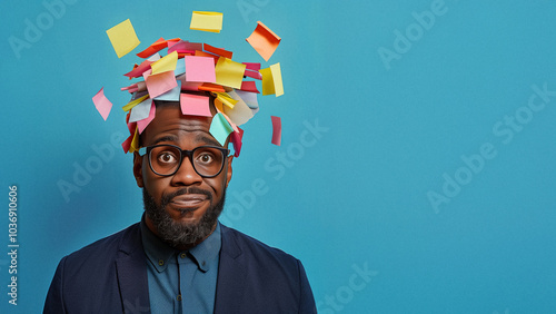 Black man with colored sticky notes over head. Too many tasks,ideas thoughts empty background