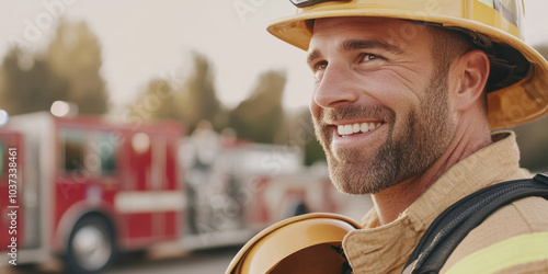 A smiling firefighter in uniform stands confidently, showcasing bravery and dedication. warm sunlight highlights his features, creating sense of pride and camaraderie