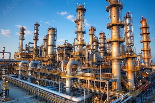 Industrial complex with tall refining towers and piping under a clear blue sky during the day