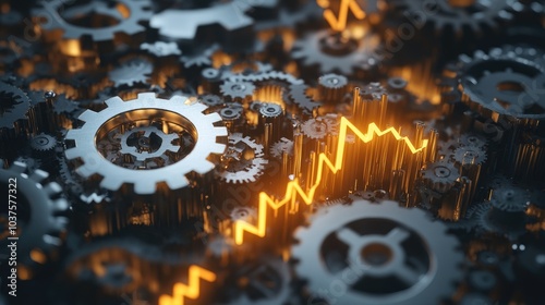 Cogwheels and ascending arrows representing operational excellence technology optimization innovation and growth in production
