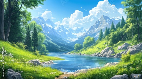 Scenic landscape featuring a riverbank with mountains in the background surrounded by lush trees green grass rocky hills and a clear blue sky ideal for a spring or summer setting