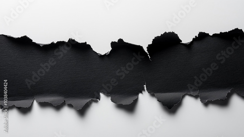 Czarne, podarte kawałki papieru tworzą interesującą szczelinę na czystym białym tle.