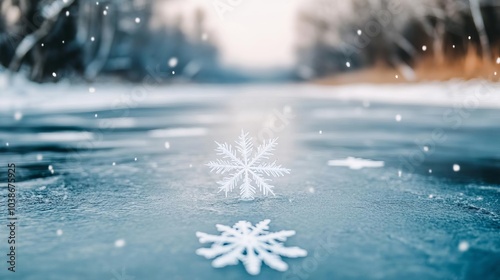 Snowflakes landing on a frozen river, capturing winter s cold stillness