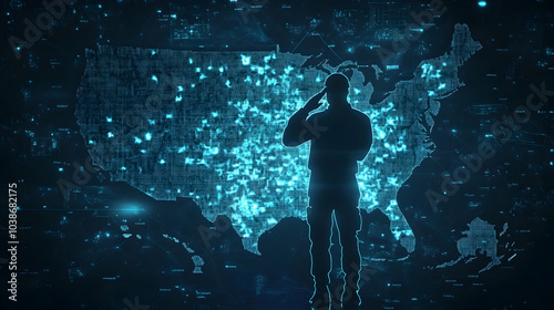 Futuristic Silhouetted Soldiers Saluting on Patriotic American Map for Veterans Day