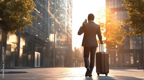 Businessman, phone call and walking with suitcase in city for conversation, travel or work trip outside building. Man or employee talking on mobile smartphone with bag for outdoor business proposal