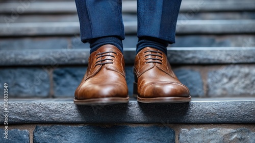 Closeup of determined businessmans feet ascending a steep staircase, business concept