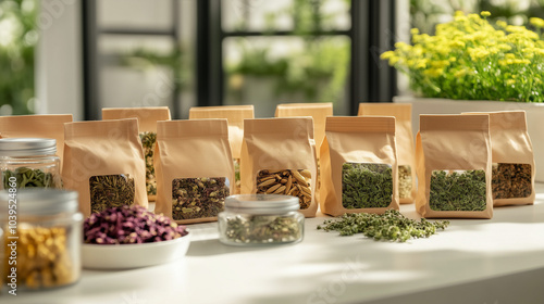 Torebki wypełnione ziołami. co pozwala skupić się na naturalnych produktach. Każdy element sugeruje holistyczne podejście do pielęgnacji, łącząc nowoczesność z naturą.