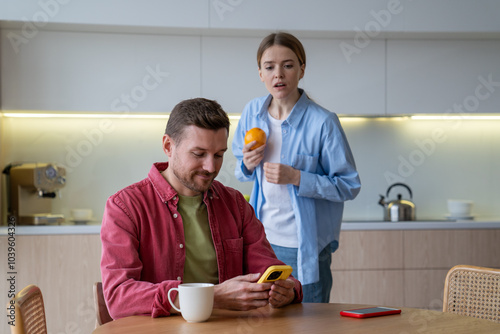 Woman secretly reads husband messages over shoulder while he chats on kitchen. Suspicion, trust issues, relationship doubts, emotional distance, betrayal fears, jealousy, invasion of privacy
