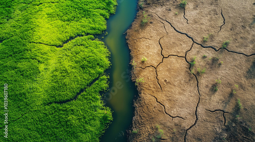 Dynamiczna kompozycja ukazuje proces zmiany klimatu: z surowego, wysuszonego terenu, gdzie brakuje życia, do zielonych przestrzeni pełnych roślinności i zwierząt.