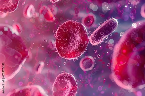 Influenza virus particles seen in the blood with erythrocytes and leukocytes, indicating infection.