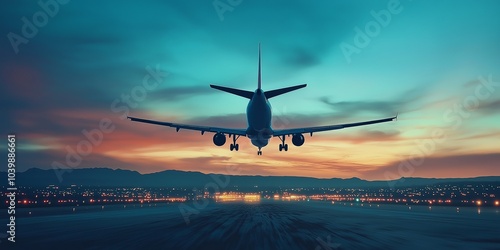 A silhouette of an airplane takes off on a vibrant runway during sunset.