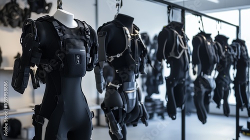 A high-tech wearable exoskeleton development studio with robotic suits and mobility assistance devices, Exoskeleton style, photo of