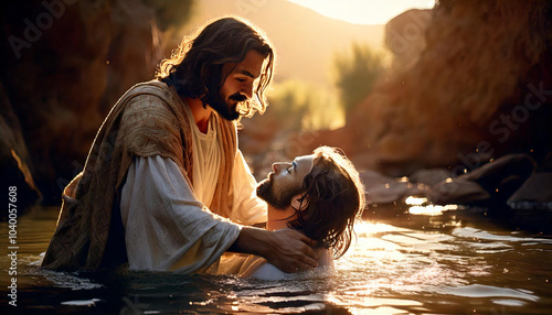Jan Chrzciciel udzielający chrztu Jezusowi w rzece Jordan.