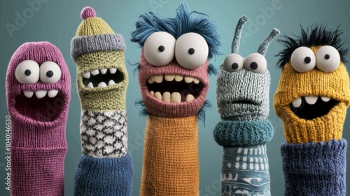 A group of colorful, playful monster puppets with expressive faces, showcasing various textures and features in a whimsical arrangement against a simple backdrop.