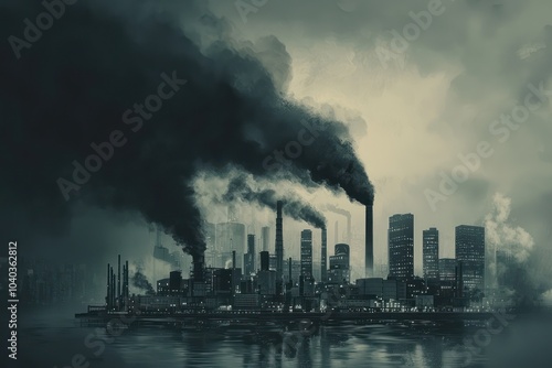 Depiction of a polluting industrial plant with CO2 emissions visualized as dark smoke against a city skyline, highlighting environmental challenges.