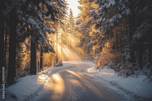 Golden sunlight peeks through snow-laden trees along a winding forest road, casting radiant beams and enchanting the serene winter landscape with warmth and light.