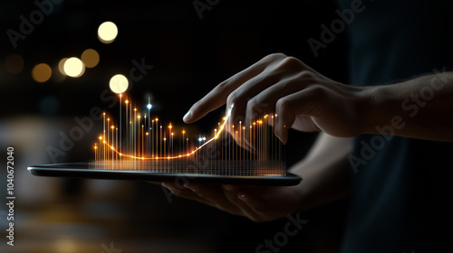 #968357583Open hand holds glowing holographic bar chart with upward arrow, symbolizing financial growth, business success, innovation, and futuristic technology in dark background