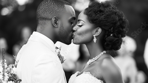 W magicznej atmosferze po ceremonii ślubnej, pan młody z uśmiechem na twarzy pochyla się nad swoją żoną, by złożyć jej słodki pocałunek.