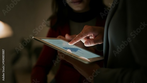 Two people reviewing graphs on a tablet screen in a dimly lit room.