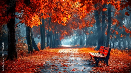 A vibrant autumn park with a canopy of fiery red and orange leaves, a path covered in fallen leaves, and a wooden bench waiting to be sat on