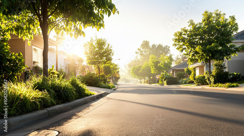 peaceful suburban street illuminated by warm sunlight, surrounded by greenery
