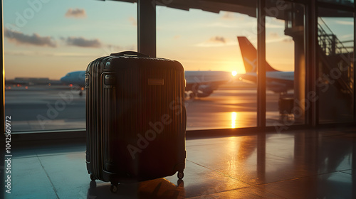 Suitcase stands in airport terminal during vibrant sunset, with airplane visible through large windows