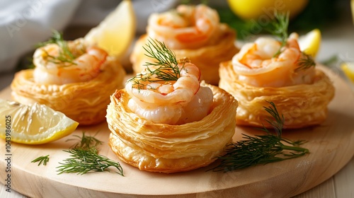 Puff pastry vol-au-vents with shrimp and dill, on a light wooden board, decorated with lemon wedges and dill sprigs