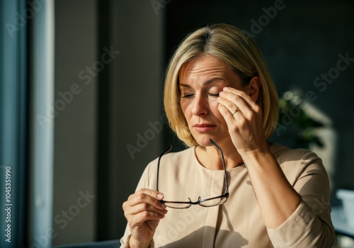 Businesswoman is taking off her glasses and rubbing her eyes, suffering from headache