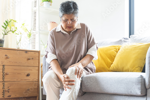 Body arthritis muscles stiff problem, aged woman suffering on leg, pain knee from disease chronic, hand massage rubbing joint injury, mature hurt or sore sitting on sofa at home. Health care people.