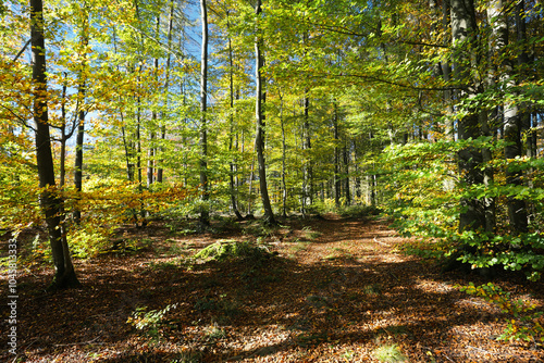 Naturimpression von Laubwald im Herbst mit viel Licht und Schatten - Stockfoto