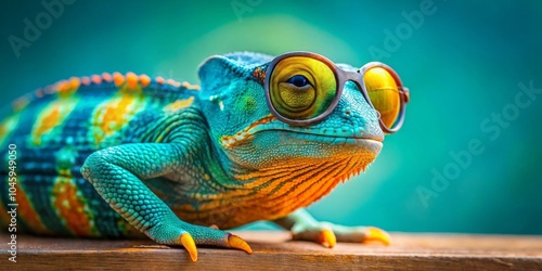 Cool Chameleon with Sunglasses on Wooden Surface, reptile, lizard